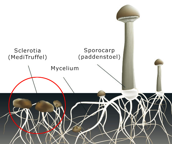 De officiële naam voor de MediTruffel is ‘Sclerotium’ (meervoud: ‘Sclerotia’). MediTruffel is een ‘bijproduct’ van de psychoactieve paddenstoel en bevat net als de paddenstoel de psychoactieve stoffen psilocybine en psilocine. Er zijn zo’n zes verschillende soorten. De hoeveelheid psychoactieve stof is per soort verschillend.